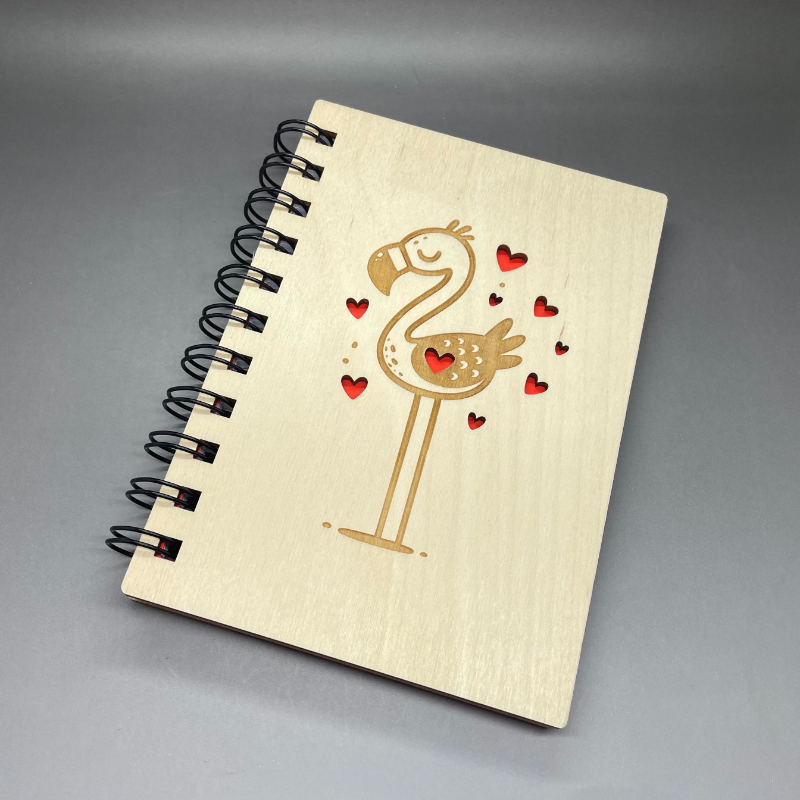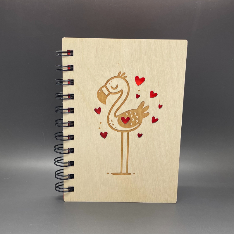 Gravírovaný dřevěný zápisník – Střední A6 – Plameňák č. 2