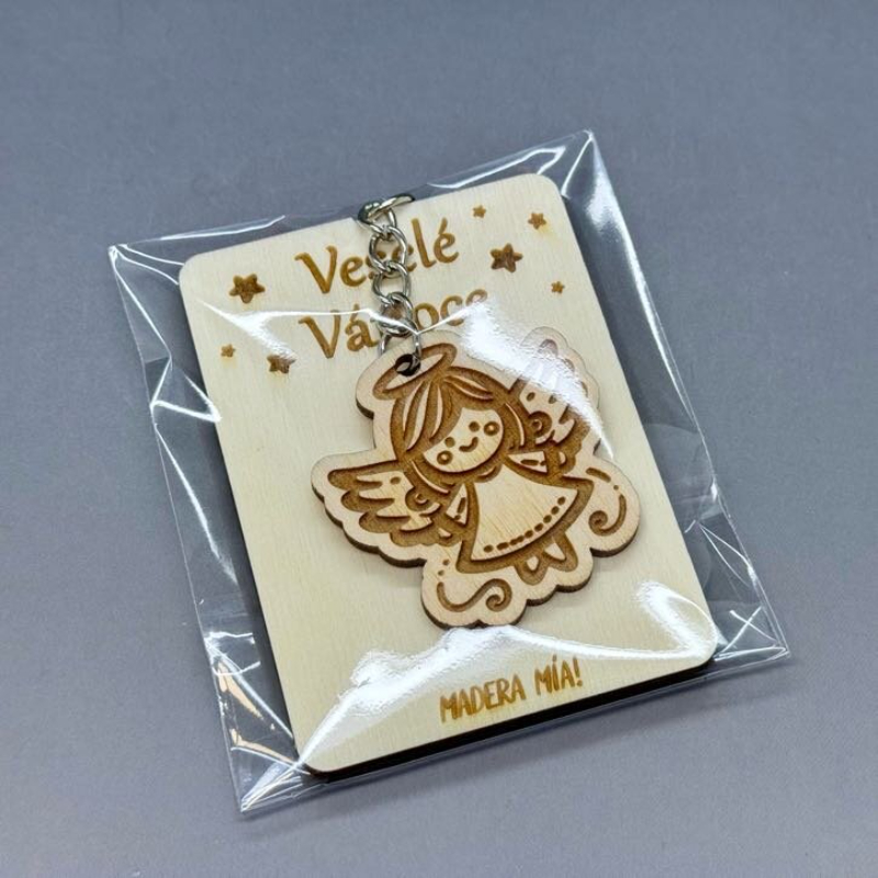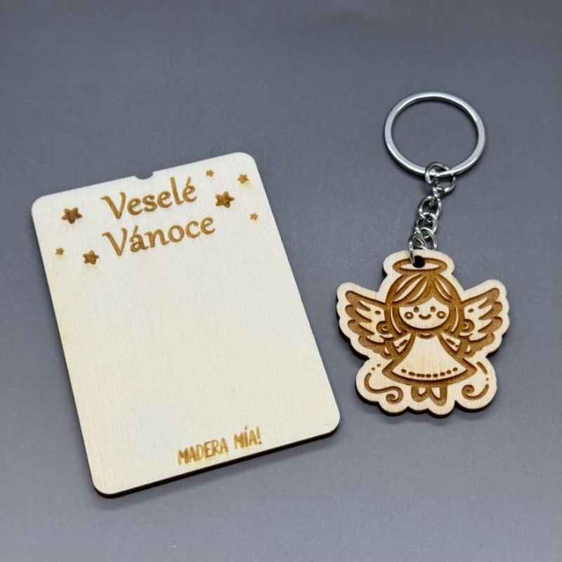 Andělíček strážníček. Klíčenka z topolové překližky na gravírované kartičce s nápisem „Veselé Vánoce“.