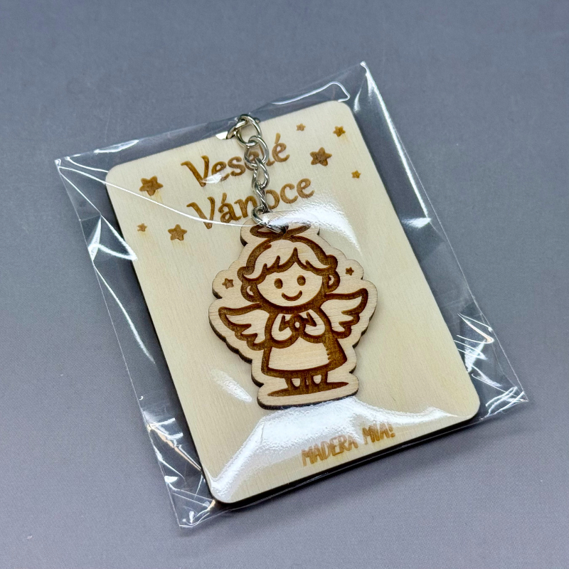 Andělíček strážníček. Klíčenka z topolové překližky na gravírované kartičce s nápisem „Veselé Vánoce“.